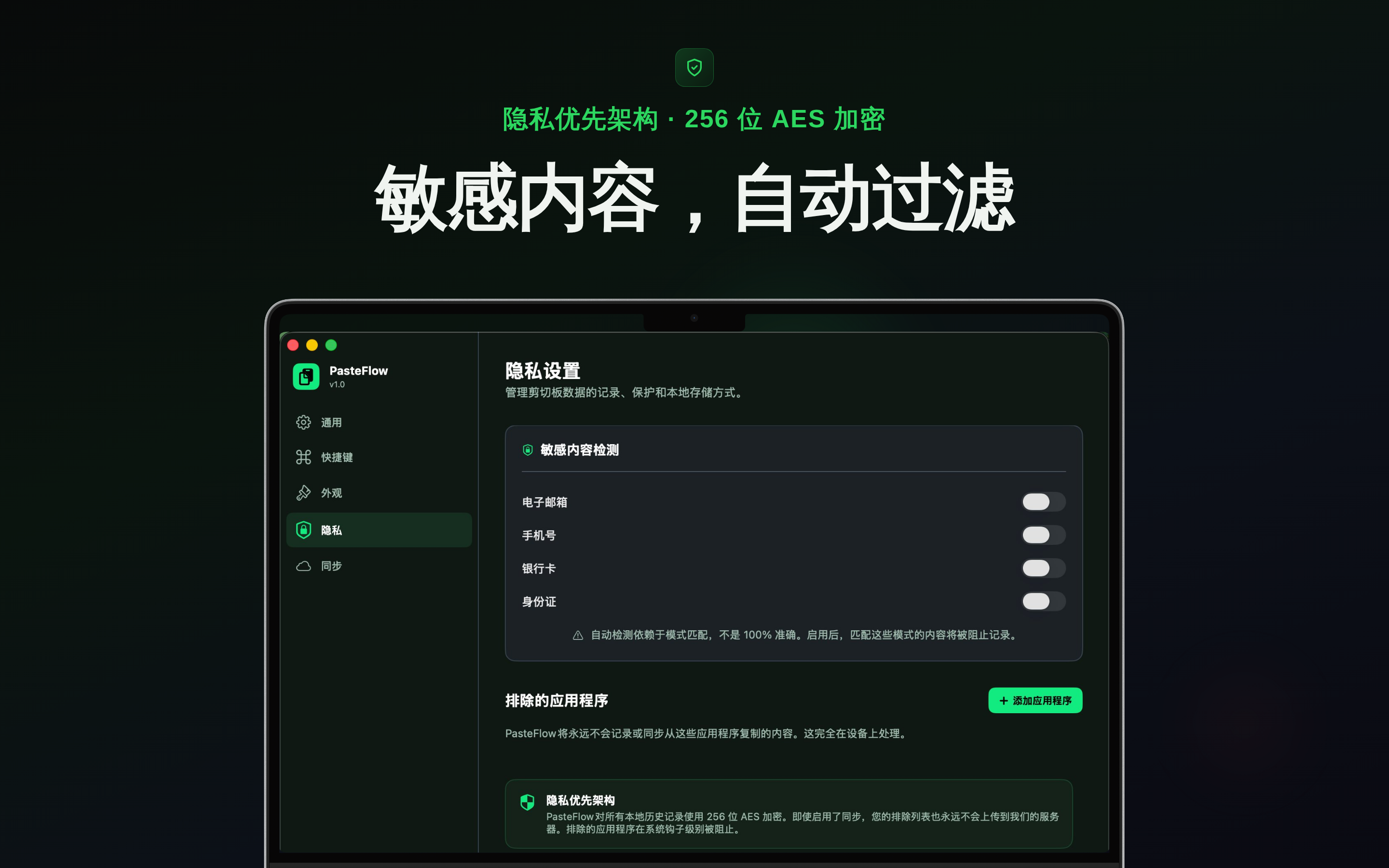 隐私安全 • 所有数据仅存储在本地,绝不上传 • 自动过滤敏感内容,保护隐私